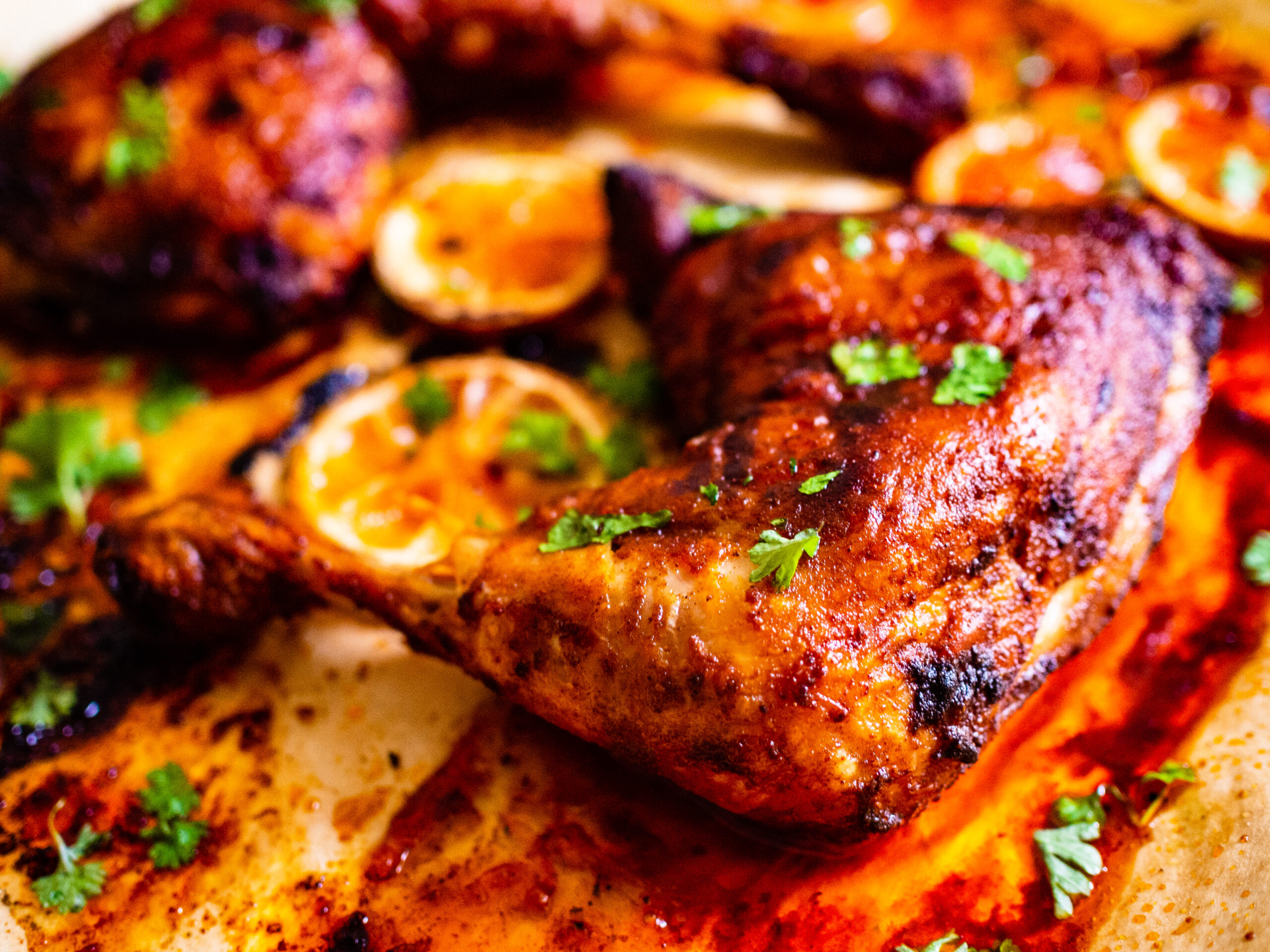 Sheet-pan barbecue chicken thighs with roast vegetables
