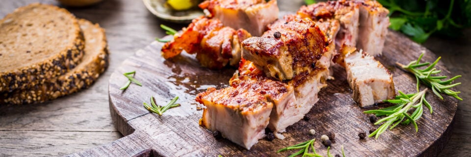 - Heat olive oil in a large skillet over medium heat. Add pork belly, thyme, rosemary, salt, and pepper. Cook for 10–15 minutes until browned and crisped.