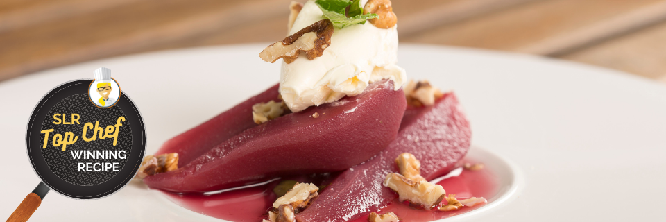 6. Place each pear on a dessert plate with a dollop of Crema de Dulce de Leche Topping and drizzle with the red wine reduction. Serve warm or chilled.